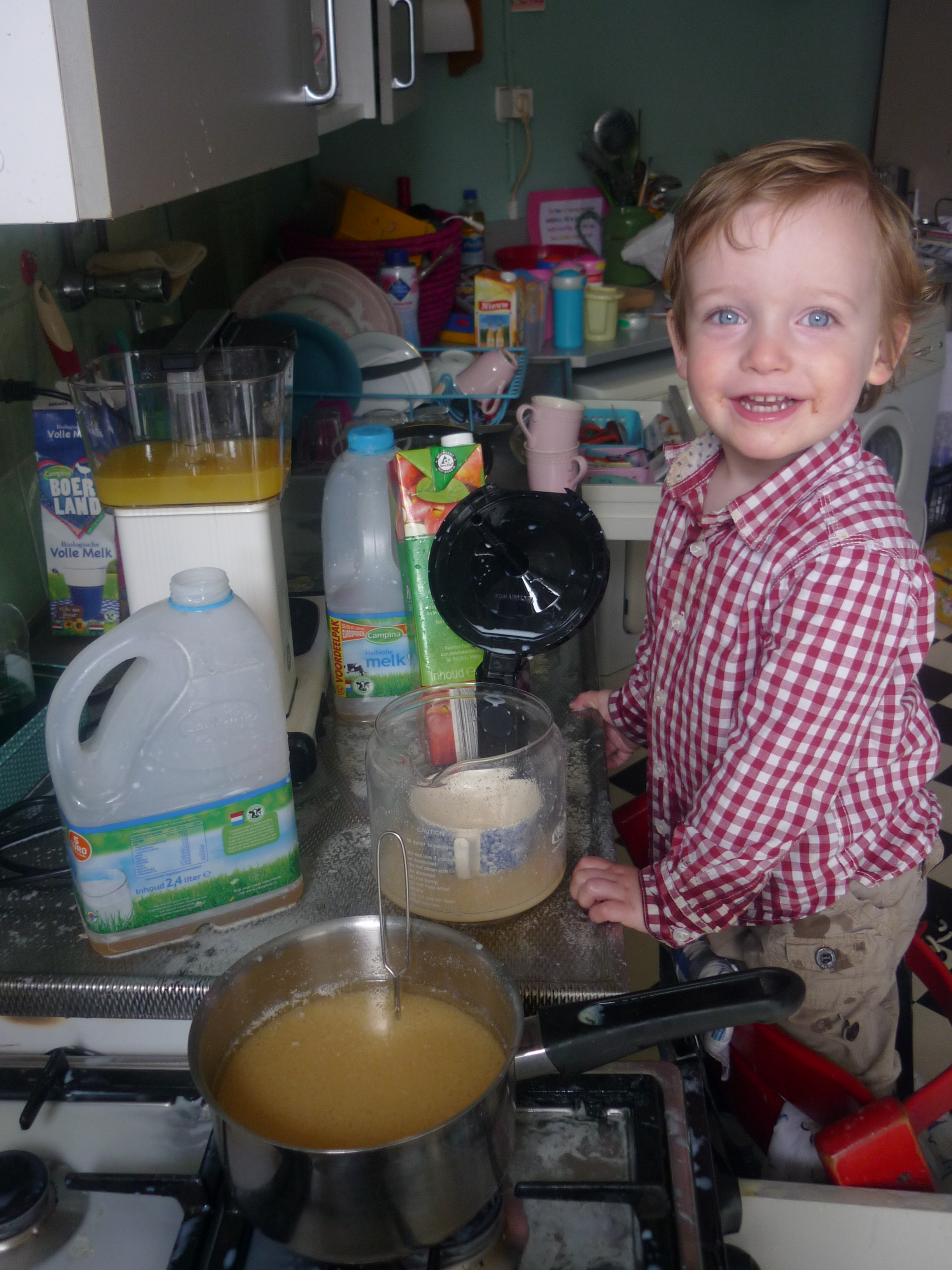 Of is een tweejarige er zich soms al van bewust dat hij zijn moeder vele lesjes nederigheid leert…(Je was zo trots op dat nieuwe koffiezetapparaat hè, daarom heb ik er sinaasappelsap in gedaan)